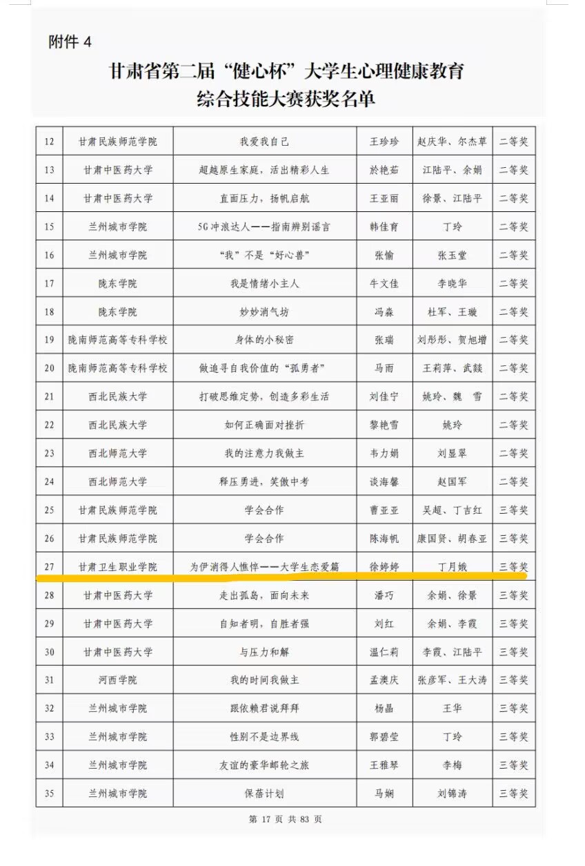 2022年10月15日,由甘肃省教育厅主办、西北师范大学心理学院和甘肃省心理学会联合承办的甘肃省大学生“健心杯”心理健康教育综合技能大赛落下帷幕,比赛结果拟推荐获奖名单于11月下旬公示10日,现已审核通过并公布,我校由心理健康教育中心主任丁月娥老师指导的徐婷婷同学在本次活动中取得了省级三等奖的优秀成绩。