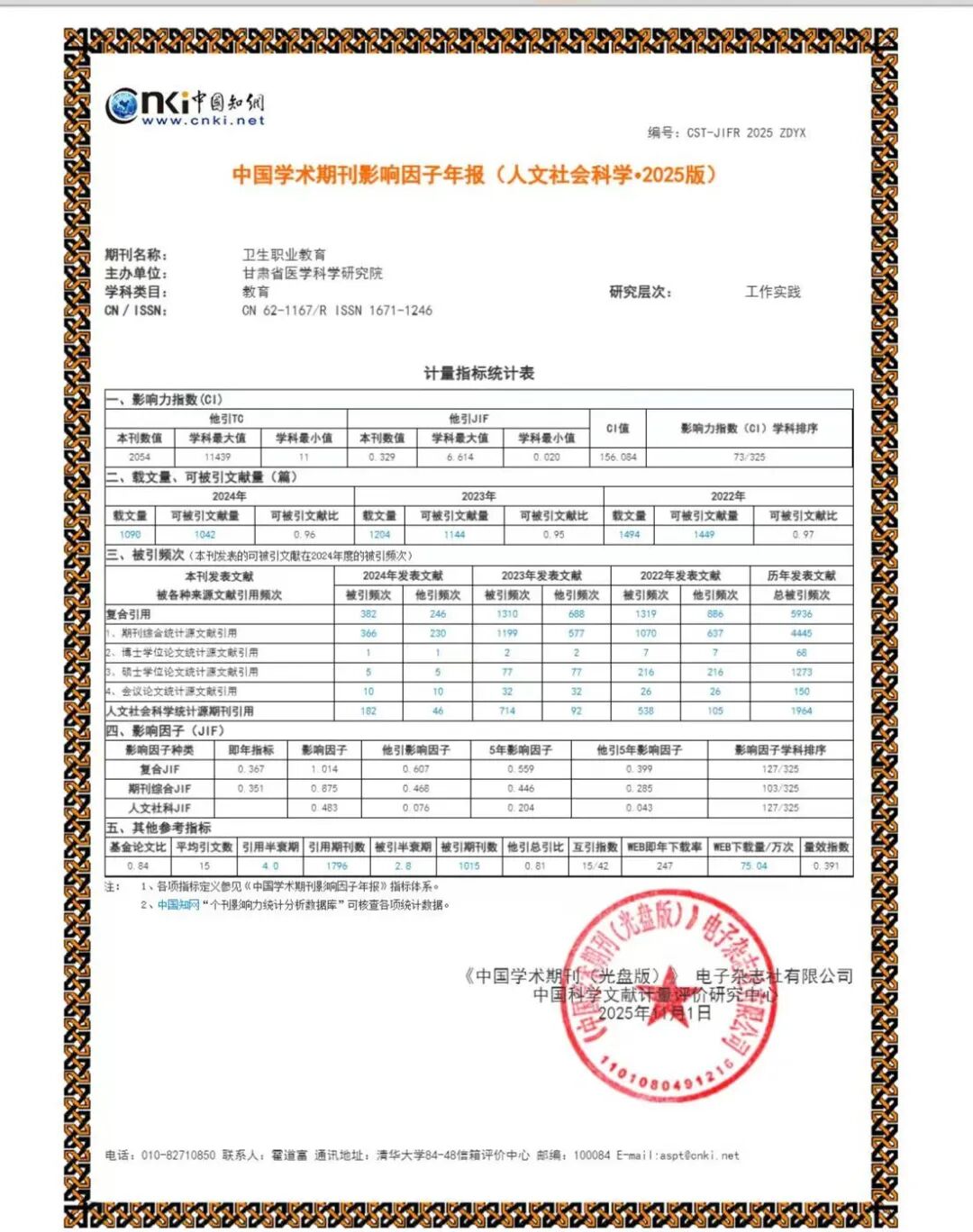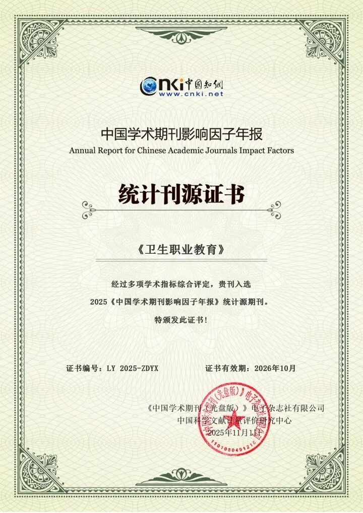 中国知网最新发布《中国学术期刊影响因子年报(2025版)》,《卫生职业教育》影响力指数CI为156.084,复合影响因子为1.014,在325种教育类学术期刊中,学科排名73名,为Q1区学术期刊(最具学术影响力和最具学术价值期刊),展现了《卫生职业教育》在医学教育、卫生职业教育领域较高的学术影响力及学科引领作用。
