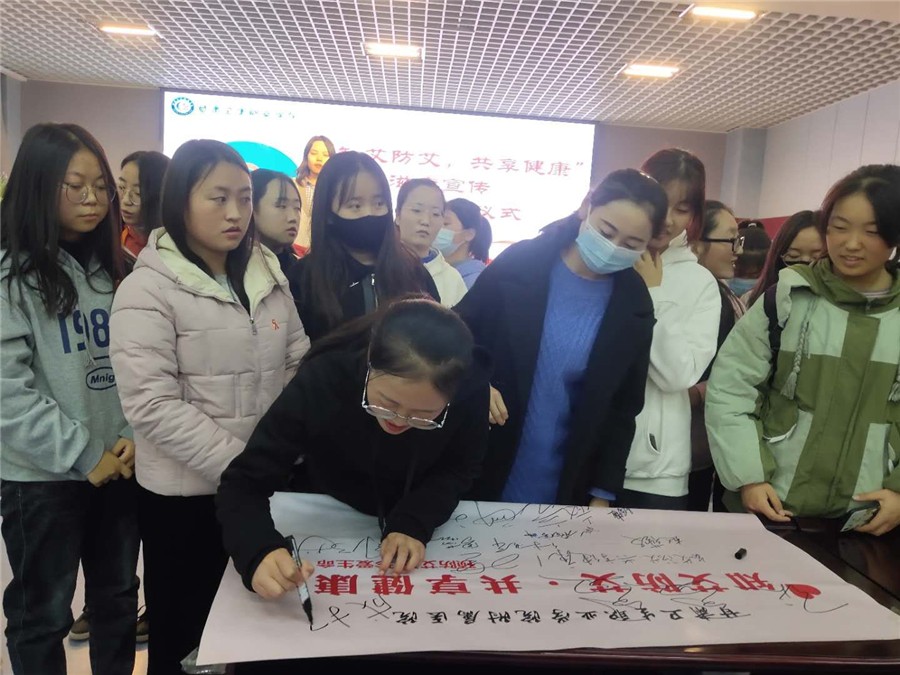 活动中,项目代表何文首先对本次活动的背景、目标、活动内容进行了介绍,鼓励各位同学能够积极参与到活动中来,为艾滋病的健康教育工作献出自己的一份力量。志愿者代表2019级医学检验技术三年制16班学生朱依萍进行了发言,她号召各位同学积极参与到本次艾滋病宣传系列活动中来,树立正确的社会责任意识,呼吁每个同学关注艾滋病。接着,附属医院付亚平主任讲话并宣布“知艾防艾,共享健康”艾滋病健康教育系列活动正式开始。活动开始后,全体参会人员在“防艾”签到墙上签字。自此,学院艾滋病防治宣传系列活动正式拉开序幕。