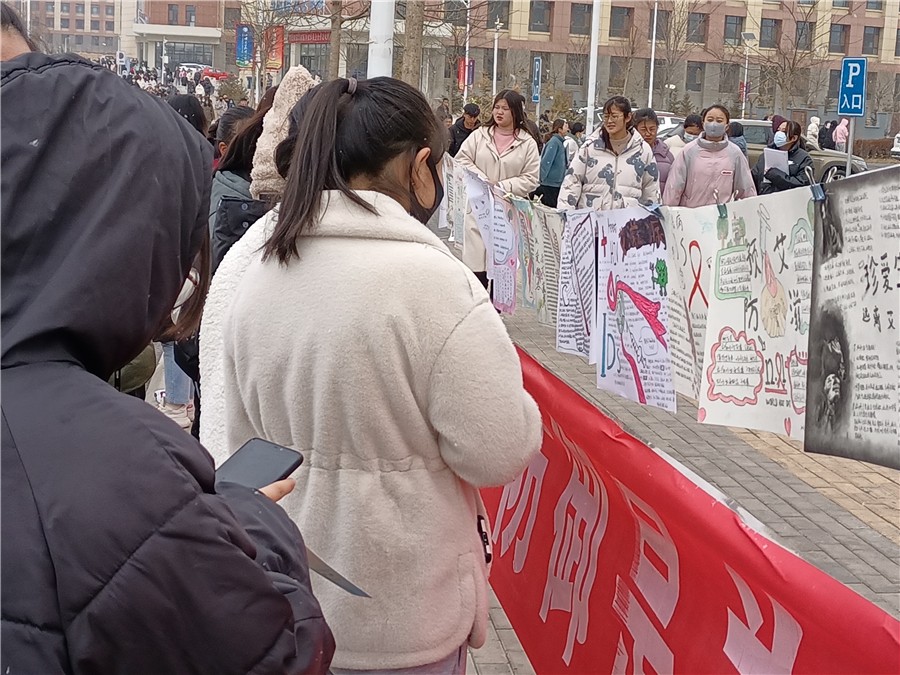 活动当天大雪纷飞,校医和同学们一起在食堂门口、教学楼、体育馆和宿舍楼向大家发放艾滋病宣传彩页,进行艾滋病相关知识宣教。宣教内容以艾滋病的预防为主,通过现场讲解来加强同学们对艾滋病的认识和关注,让同学们懂得如何保护自己。同时也教会学生怎样去对待艾滋病患者,消除对艾滋病病人和感染者的歧视,动员每一位同学参与到艾滋病预防和关爱艾滋病病人的活动中来。