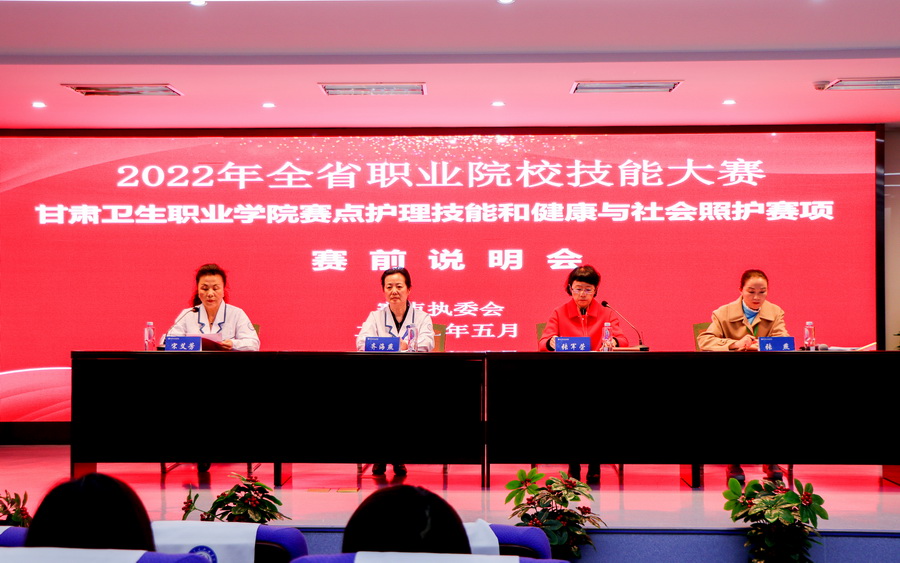 5月12日,由省教育厅、省人社厅、省财政厅、省卫生健康委、省总工会主办,甘肃卫生职业学院承办的2022年全省职业院校技能大赛甘肃卫生职业学院赛点开幕式在1号教学楼学术报告厅举行。省教育厅职成处二级调研员、全省职业院校技能大赛组委会委员、执委会委员胡晶,省职教中心副主任、全省职业院校技能大赛执委会办公室主任苏晓勤,兰州新区西岔园区党委书记龙卫东,武威职业学院副院长、赛点监督员田迎春,甘肃卫生职业学院院长、赛点执委会主任任晖,甘肃卫生职业学院纪委书记、赛点仲裁长刘斌,甘肃卫生职业学院副院长、赛点执委会副主任康逢民,甘肃卫生职业学院副院长、赛点执委会副主任张军荣出席开幕式。开幕式由康逢民副院长主持。