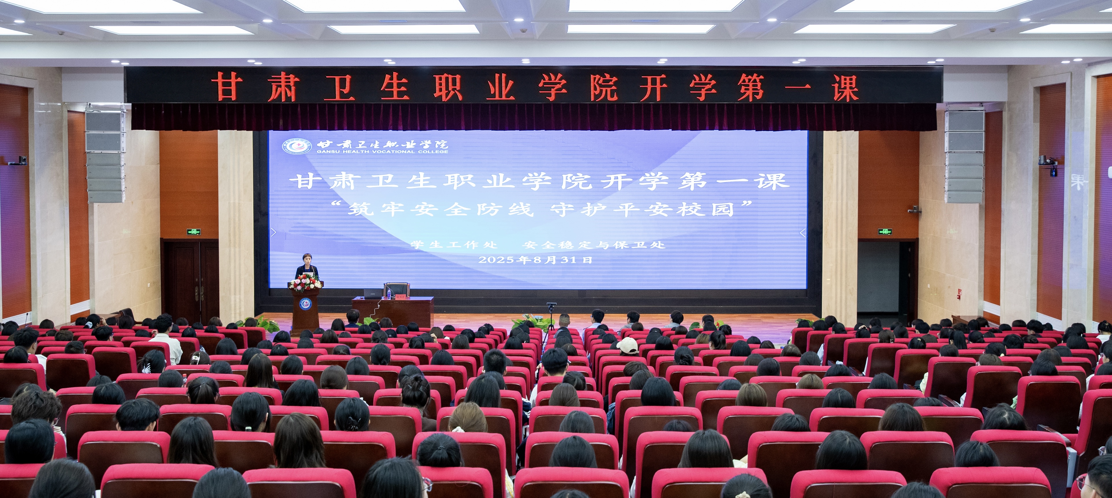 8月31日晚,学校在笃学楼学术报告厅举办2025-2026学年秋季学期“开学第一课”活动。学校党委委员、副院长杨频,兰州市公安局兰州新区分局督察审计大队副大队长、学校法制副校长张贤出席活动。430名新生代表在学校笃学楼学术报告厅现场参加,其他师生以班级为单位在教室通过视频方式同步观看收听。