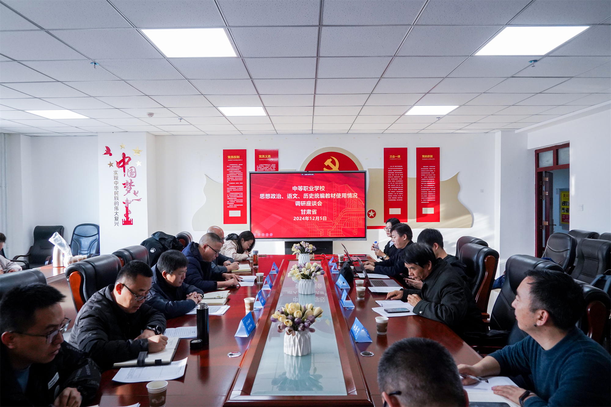 在办公楼315 会议室,调研组专家分别开展了面向教育行政部门工作人员的座谈会和面向职业院校教材管理人员的座谈会。学校党委副书记毕效武对韩江萍主任及赵昕宇副处长一行表示热烈欢迎,兰州资源环境职业技术大学、甘肃卫生职业学院、甘肃财贸职业技术学院、兰州现代职业技术学院教材管理负责人在会上就国家规划教材的管理、指导、选用、参编、监测、舆情、意见及建议等方面进行了汇报。在办公楼415会议室同期召开了中等职业学校思想政治、语文、历史统编教材使用情况调研座谈会,兰州市教育局、兰州新区教体局、兰州市卫生学校、兰州市城市建设学校教材管理负责人参加了座谈。