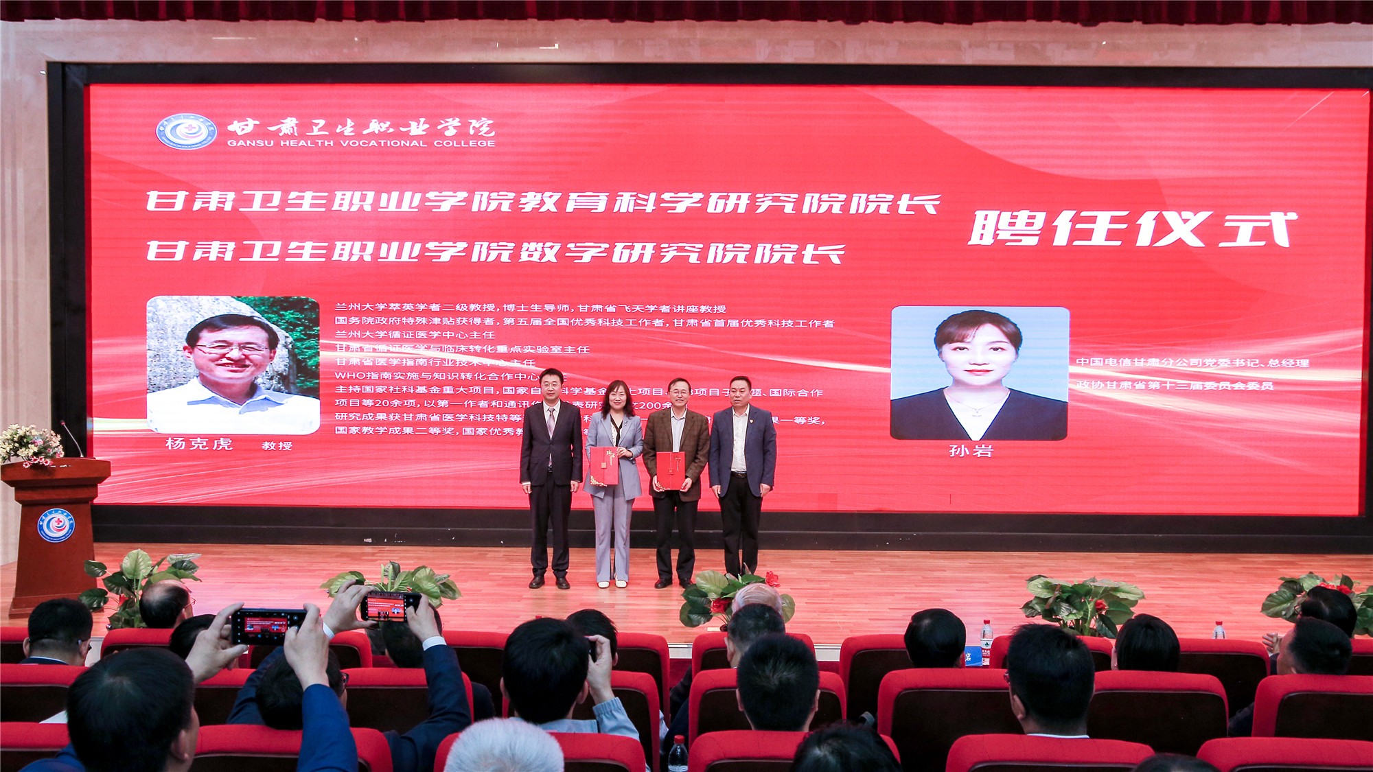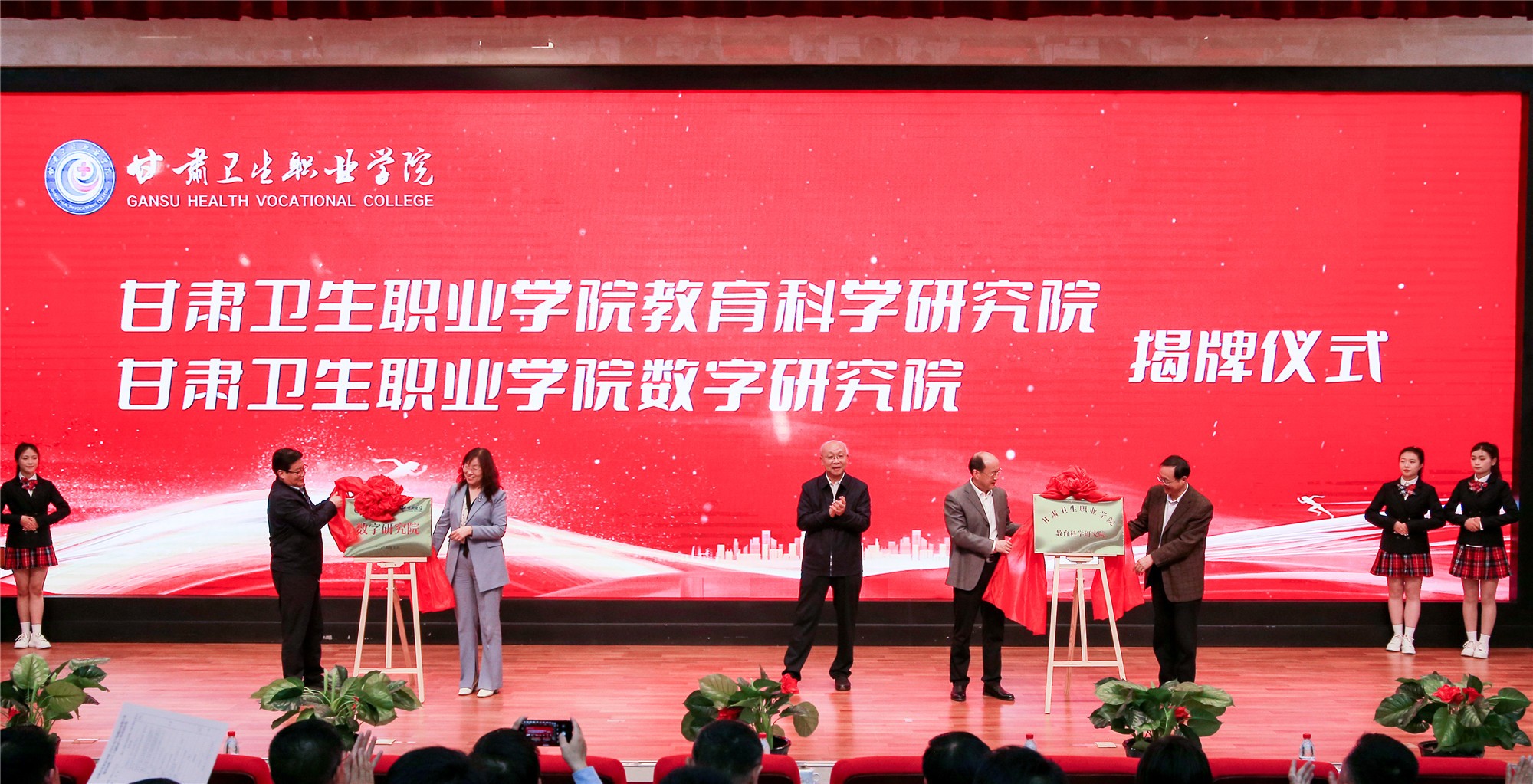 在全场热烈的掌声中,包磊书记宣布甘肃卫生职业学院教育科学研究院、数字研究院正式成立。郭天康主席、杨克虎教授、孙岩总经理、王彦成巡视员、孙敏主任为新成立学院揭牌。学校聘任杨克虎教授为教育科学研究院院长,孙岩总经理为数字研究院院长,包磊书记、王建成校长为两位院长颁发证书。