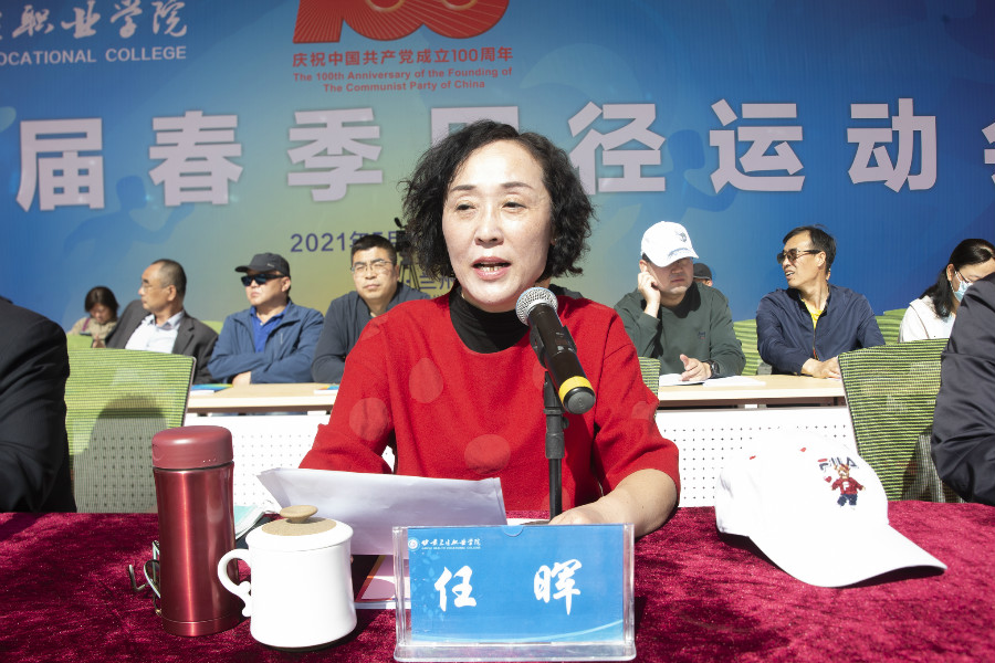 校长任晖致开幕辞。她代表学校领导班子向运动会的胜利召开表示热烈的祝贺,向刻苦训练、积极参赛的运动员致以亲切的问候,向参与筹备工作的师生表示衷心的感谢。她表示,田径运动会是学校一年一度的体育盛会,是广大师生展现阳光、健康、向上精神风貌的精彩舞台,是对学校体育工作的一次检阅,是对同学们身体素质、心理素质、竞技水平的综合检验,更是对各参赛队竞争意识、集体意识、顽强拼搏精神的综合体现。她希望全体运动员能以高昂的斗志和顽强的精神积极参赛,为集体增光,在赛场上尽情体验竞赛的魅力,全面诠释体育精神,努力拼搏,超越自我,充分展现昂扬向上的青春活力、奋发进取的精神风貌和全面发展的优良素质;希望全体与会人员运动场上讲风格、奋勇争先、赛出水平,运动场下讲公德、安全有序、文明助威;希望全体裁判员严守规程,公正裁判,维护良好的竞赛秩序。最后她讲到,今年是中国共产党成立100周年,让我们以健康的体魄、更加饱满的精神投入到学习、工作和生活中去,在更高、更快、更强的体育精神的指引下,以百折不挠、脚踏实地的信念和时代精神共同把我们的事业推向前进,以实际行动向党献礼!