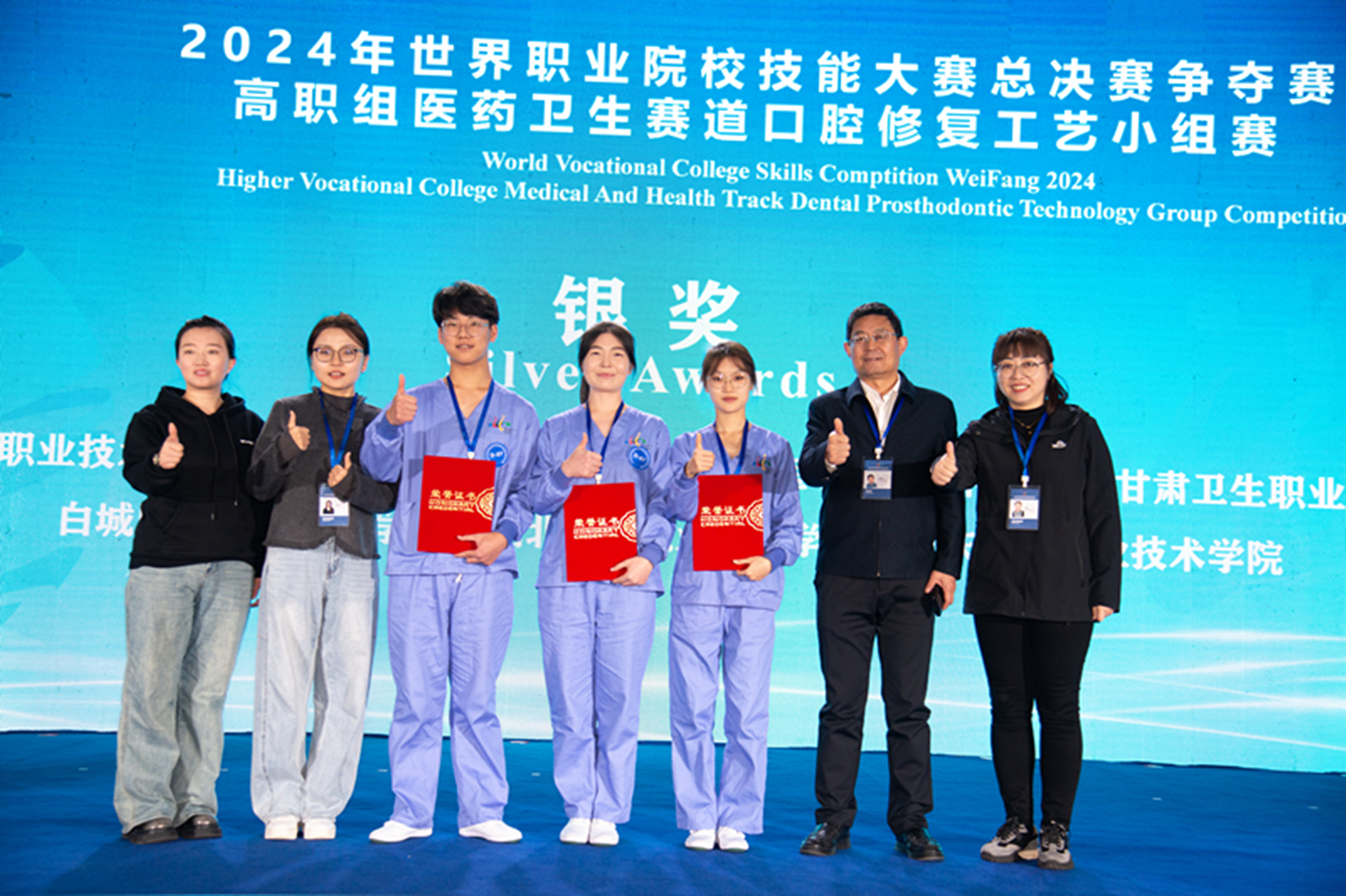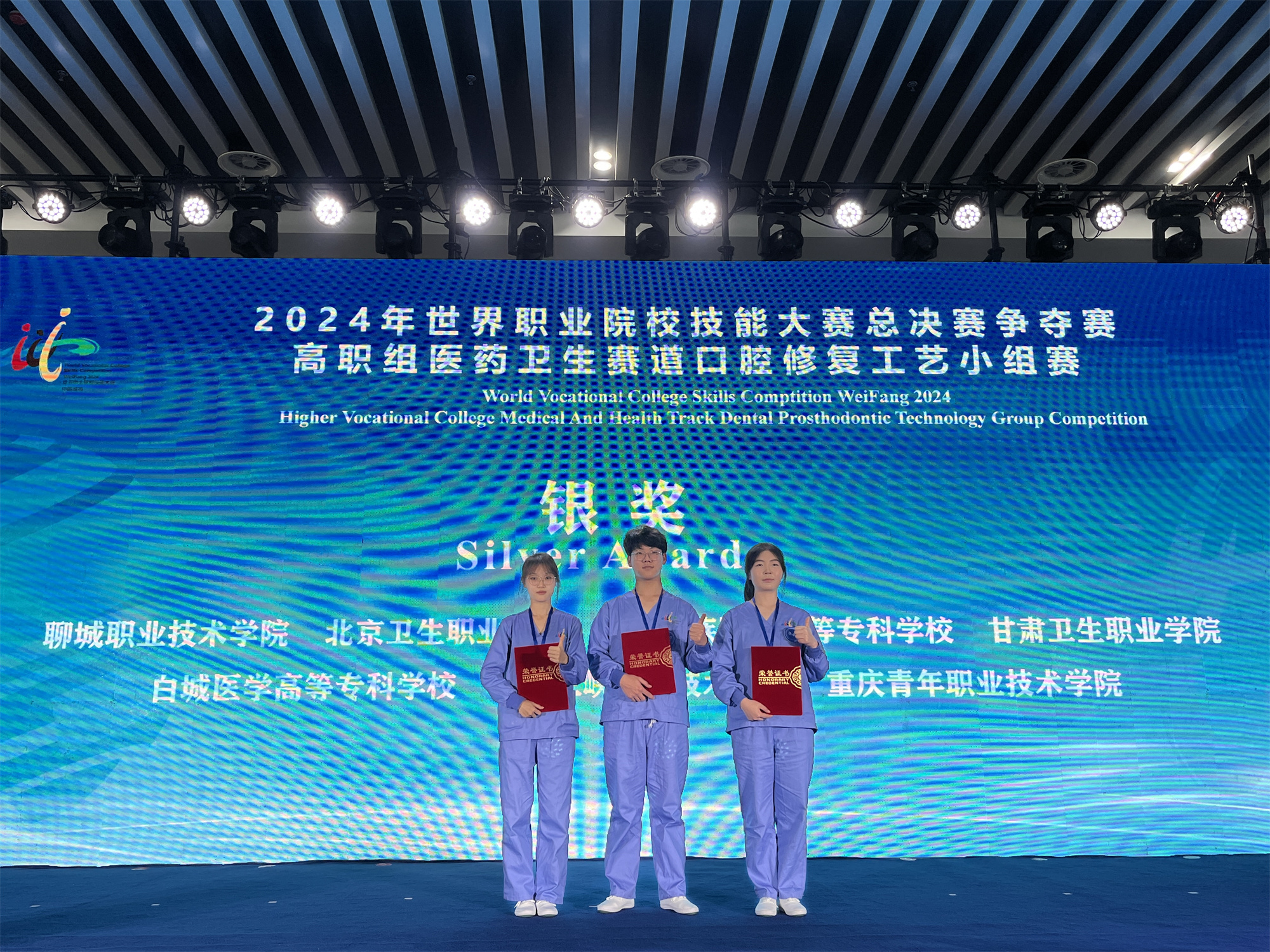 10月29日至30日,2024年世界职业院校技能大赛总决赛医药卫生赛道三(口腔修复工艺赛项)争夺赛在山东潍坊高铁北站综合体成功举办。来自全国各地47支优秀参赛队,共171名参赛选手同台竞技。我校参赛选手郭瑩春、刘芳银、尚天路以平行组第3名总分620的成绩荣获银奖。