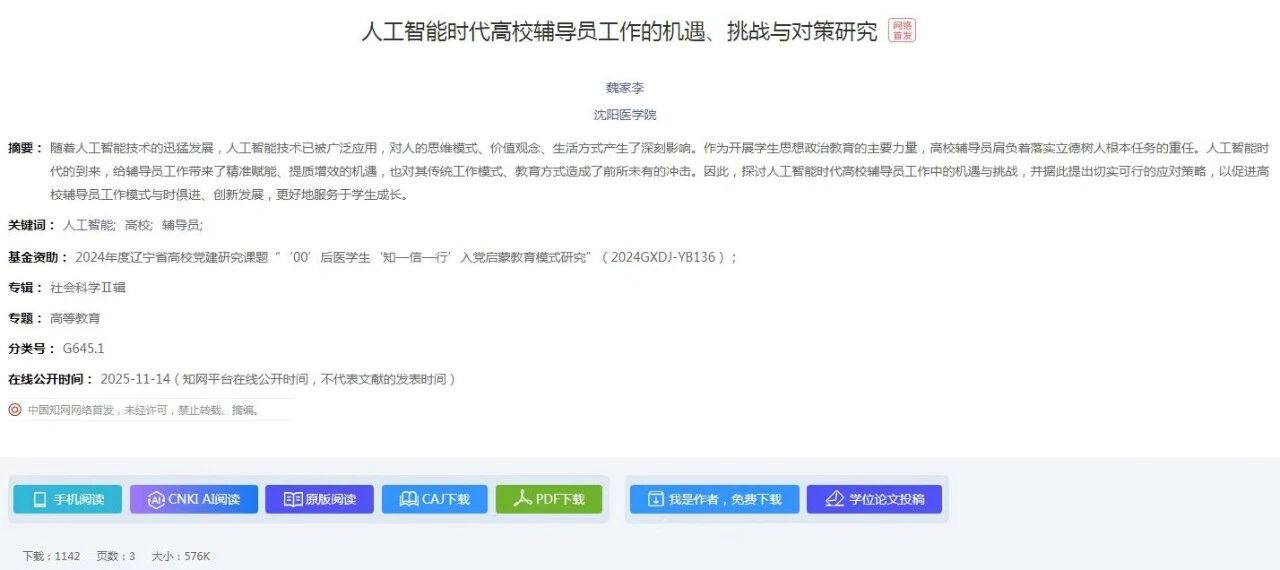 2025年11月14日,沈阳医学院魏家李副教授的论文《人工智能时代高校辅导员工作的机遇、挑战与对策研究》网络首发,五天内下载量突破1000。