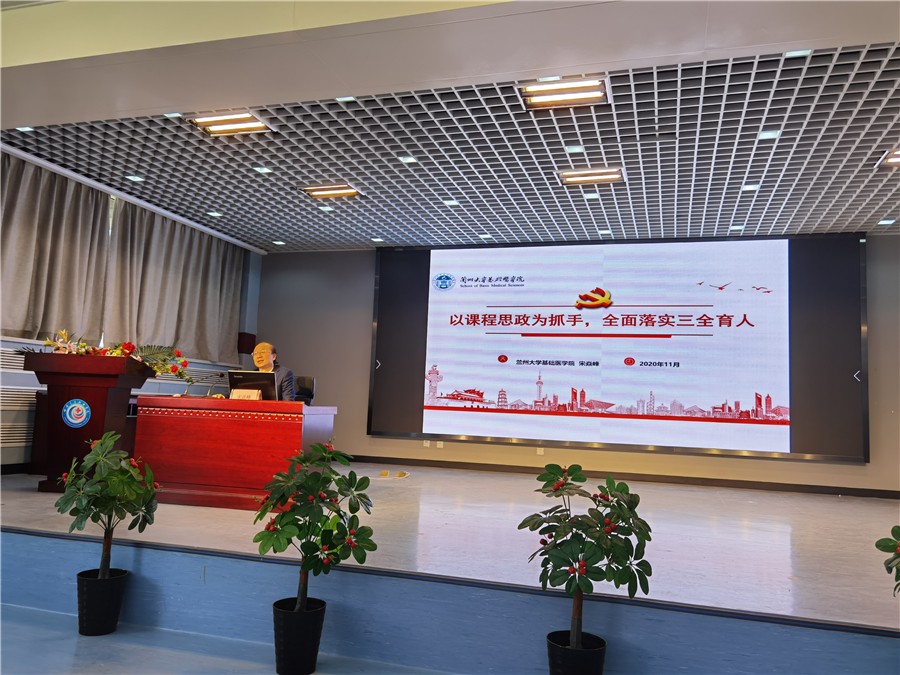 宋焱峰教授首先作了题为“以课程思政为抓手,全面落实三全育人”的主题讲座。他从课程思政开展的时代背景、什么是“课程思政”、 如何推动课程思政、课程思政建设规划、课程思政实例分析等五个方面,详细解读了习近平总书记关于教育工作的系列讲话和重要指示,辨析了“课程思政”与“思政课程”的关系,精讲了课程思政的内涵和特征、对教师的要求、设计思路等;分享了兰州大学基础医学院在课程思政建设方面的规划 、经验和成效;实例分析了如何在不同医学专业课程中发掘思想政治教育元素,并将思政教育融入到课堂教学中,发挥专业课程的育人作用。