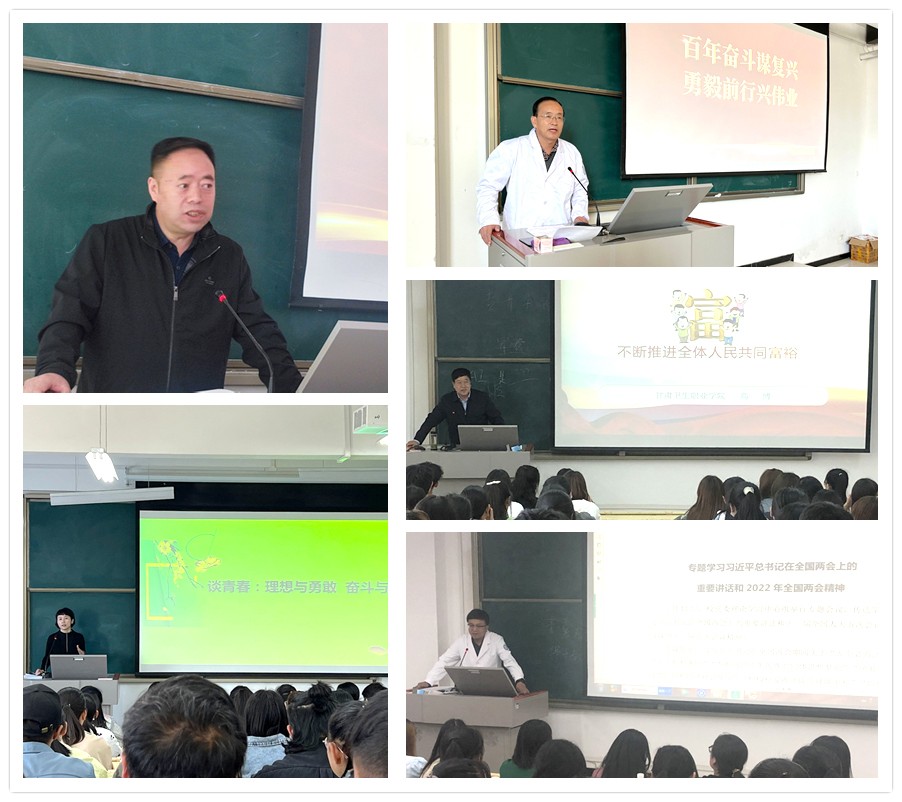 党委领导班子其他成员分别以《把青春播撒在民族复兴的征程上—学习习近平总书记在建团百年庆祝大会上的讲话》、《站在历史正确的一边 共创祖国统一伟业》、《百年奋斗谋复兴 勇毅前行兴伟业》、《全民国家安全教育》、《不断推进全体人民共同富裕》、《谈青春:理想与勇敢 奋斗与成长》、《专题学习习近平总书记在全国两会上的重要讲话和2022年全国两会精神》等为专题,充分发挥自身学术素养和实践经验,在课堂上用鲜活生动的朋辈事例、通俗易懂的简明语言、清晰明了的逻辑魅力激励着青年大学生。