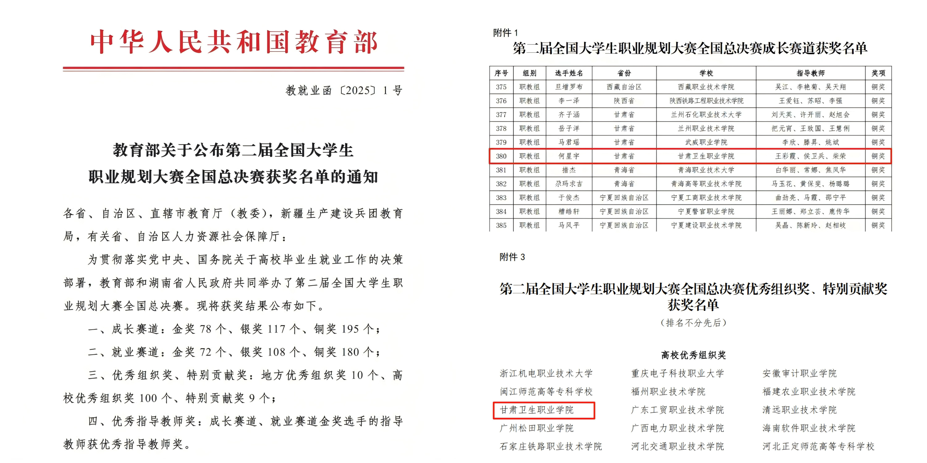 近日,教育部正式公布第二届全国大学生职业规划大赛全国总决赛获奖名单,我校中医学院2023级针灸推拿专业学生何星宇荣获成长赛道(职教组)全国铜奖,学校获评全国“高校优秀组织奖”,是本届大赛中甘肃省唯一获此奖的高校。“双奖”的获得,实现了学校在此类国家级赛事中的奖项荣誉的历史性突破。