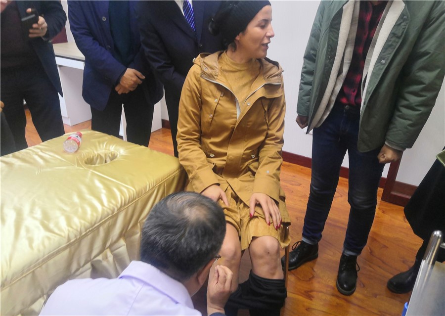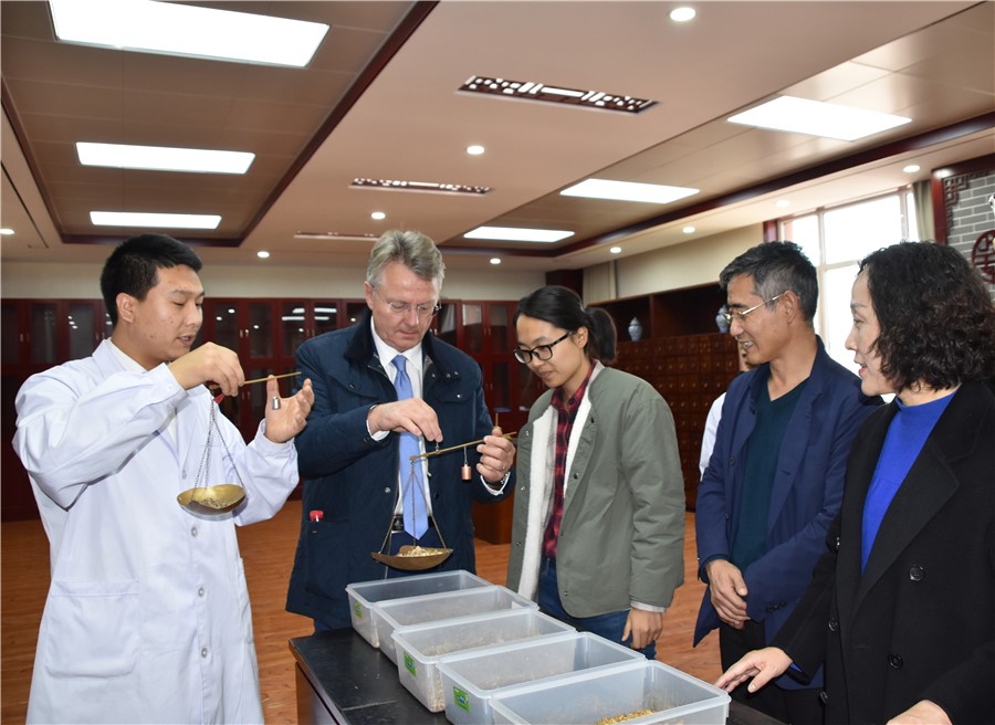 在中医药学院,戈尔曼·登内博格司长一行饶有兴趣地参观了推拿手法、画经点穴、舌诊、脉诊、中药调剂和推拿针刺等实训场所,通过动手操作和亲身体验,来宾们被中医药的深厚底蕴和神奇魅力深深感染。