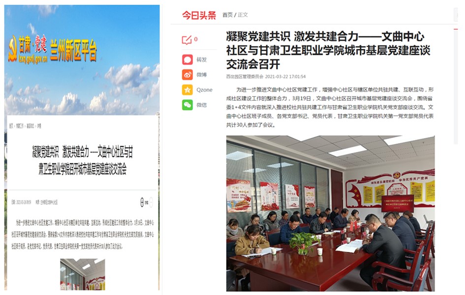甘肃党建、今日头条平台报道我校机关第一党支部与文曲中心社区党支部举办基层党建座谈交流会发布时间:2021-04-02 -