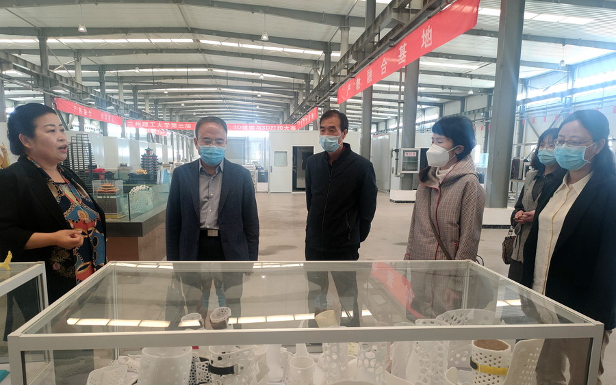 考察队一行在甘肃普锐特科技有限公司总经理潘盈的带领下参观了3D打印材料、产品和设备,并进行了交流座谈。