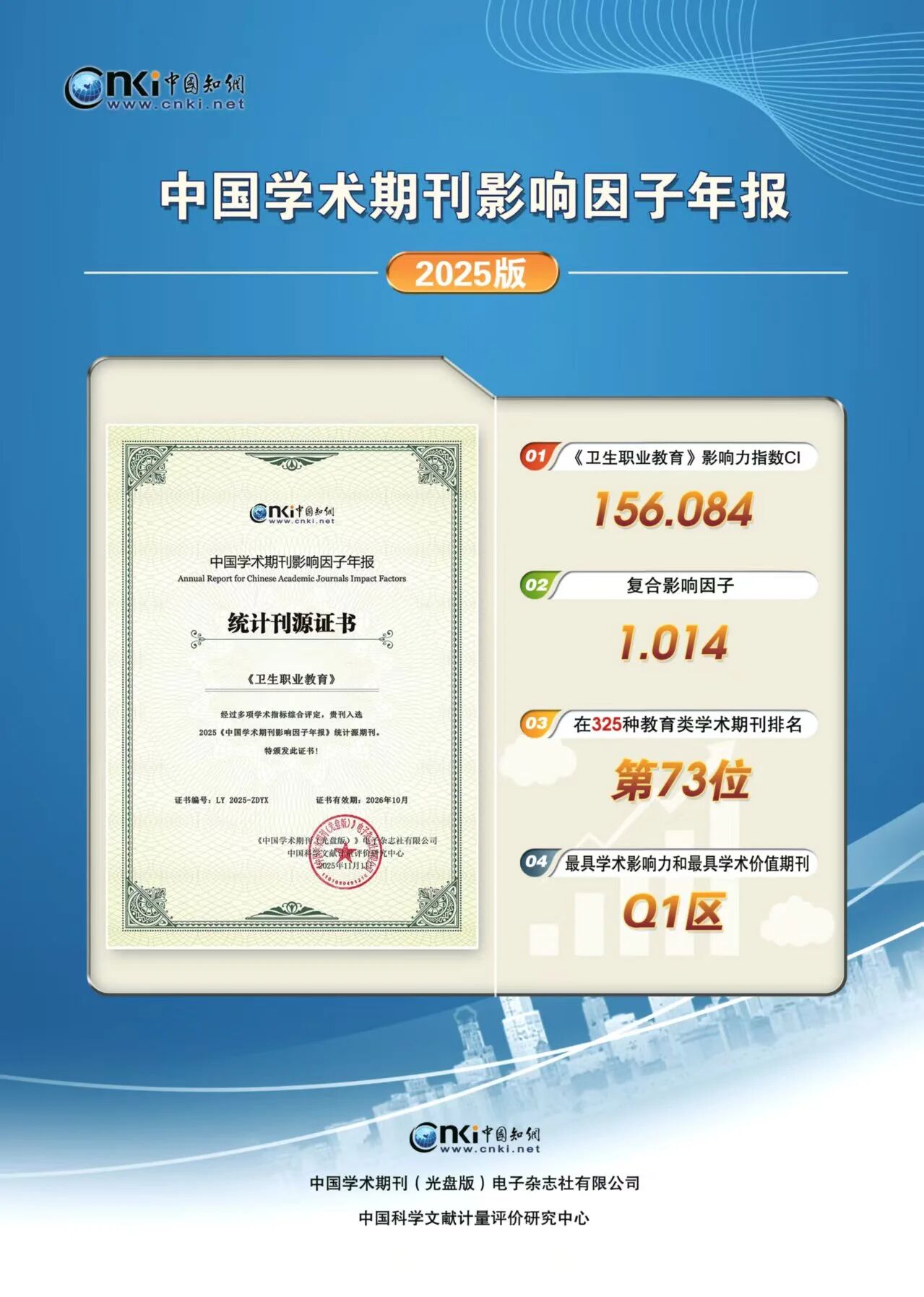 自1983年创刊以来,《卫生职业教育》长期坚守应用型、实践型办刊导向,精准聚焦医学教育、卫生职业教育核心领域的改革、发展和创新等,设置了教育管理与学生发展、课程改革研究、专业与教材建设、现代教育技术、教学探讨、实验与实习等与卫生职业教育技术技能型人才培养紧密相关的栏目,刊发了多篇兼具理论学术性、产业实用性与创新性的高质量论文。2025年《中国学术期刊影响因子年报》(中国知网2025版),《卫生职业教育》影响力指数CI为156.084,复合影响因子为1.014,在325种教育类学术期刊中,学科排名73名,为Q1区最具学术影响力和最具学术价值期刊。
