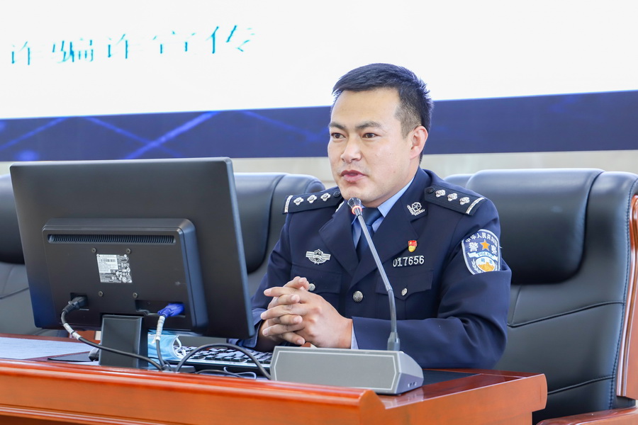 雪明警官首先就目前电信诈骗的新形势、新手段进行了深入浅出的介绍和分析,并对学校防范电信诈骗工作进行了指导。随后学生工作处张绍进处长对目前常态化疫情防控期间各学院学生工作的情况进行了详细说明。