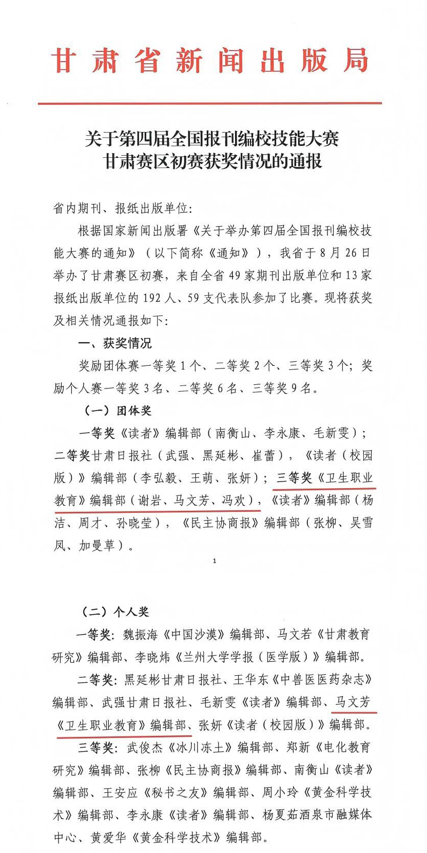 甘肃省新闻出版局报刊编校技能大赛获奖通报