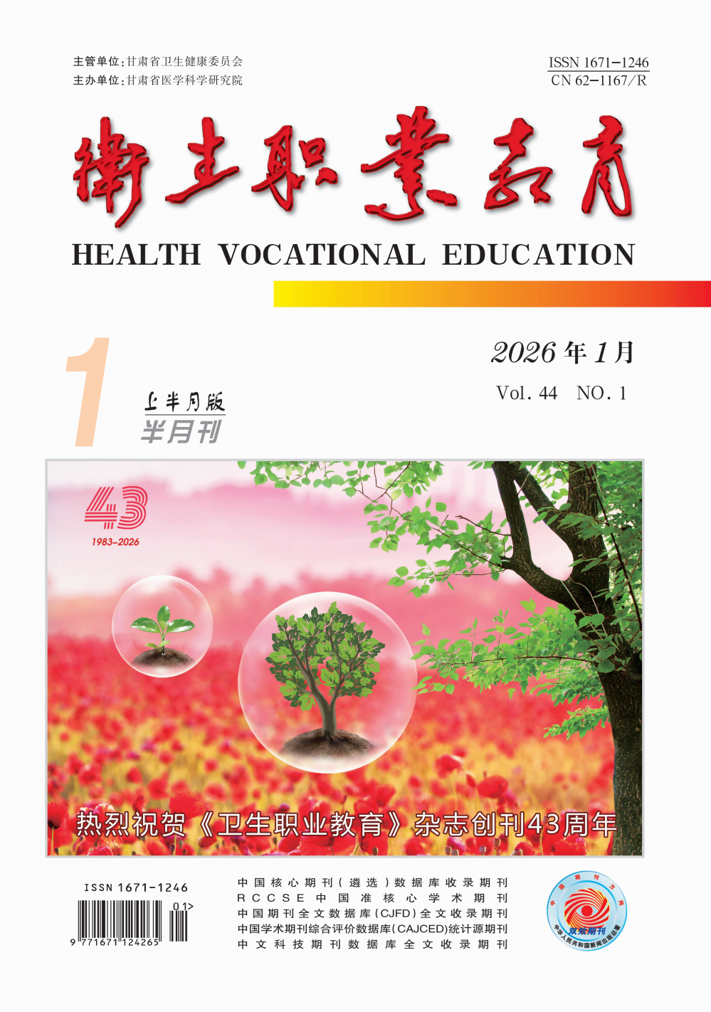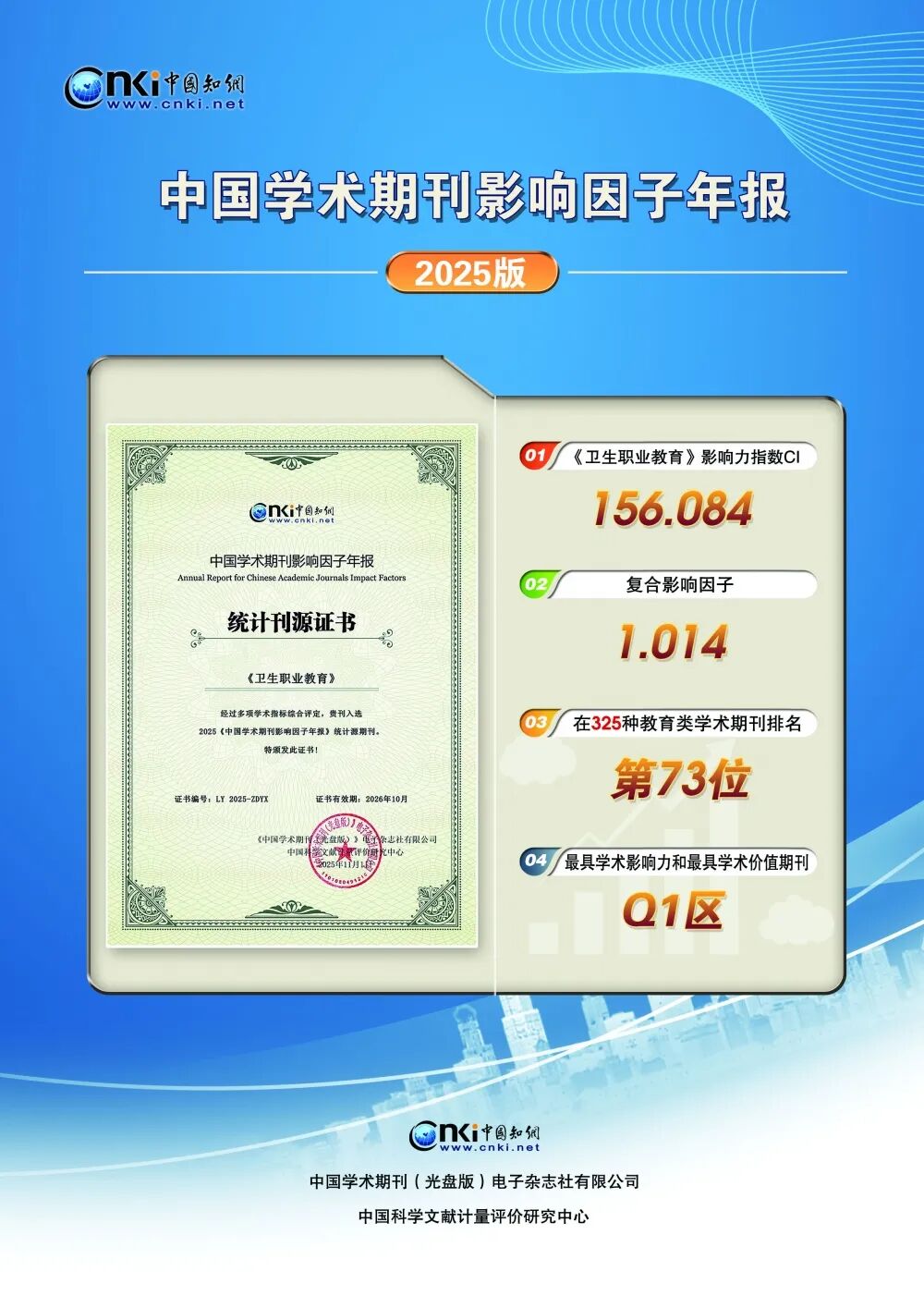 据中国知网《中国学术期刊影响因子年报(2025版)》,《卫生职业教育》影响力指数CI为156.084,复合影响因子为1.014,在325种教育类学术期刊中,学科排名73名,为Q1区最具学术影响力和最具学术价值期刊。